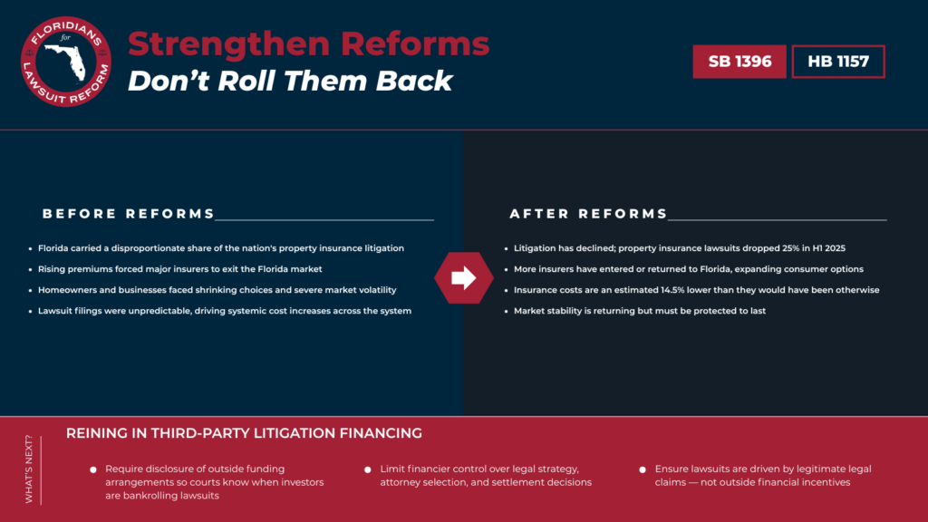 Efforts to roll back tort reforms would move Florida in the wrong direction. At the same time, proposals like SB 1396 and HB 1157, which address abusive third-party litigation financing, represent a smart and necessary next step.